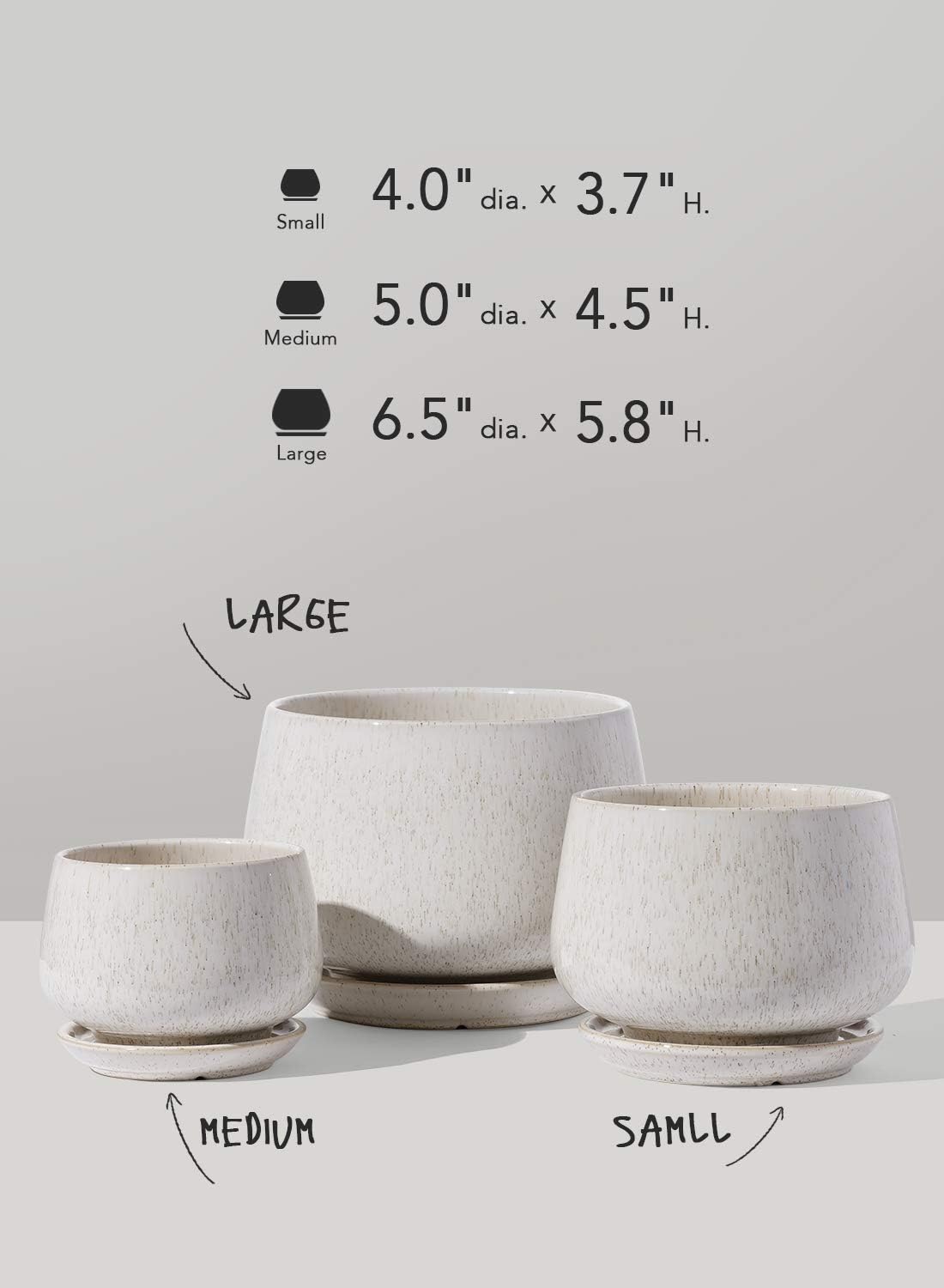 LE TAUCI Plant Pots, 4.1+5.1+6.5 inch, Set of 3, Ceramic Planters with Drainage Hole and Saucer, Indoor Flower Pot with Hole Mesh Pad, Gifts for Mom, Reactive Glaze Beige